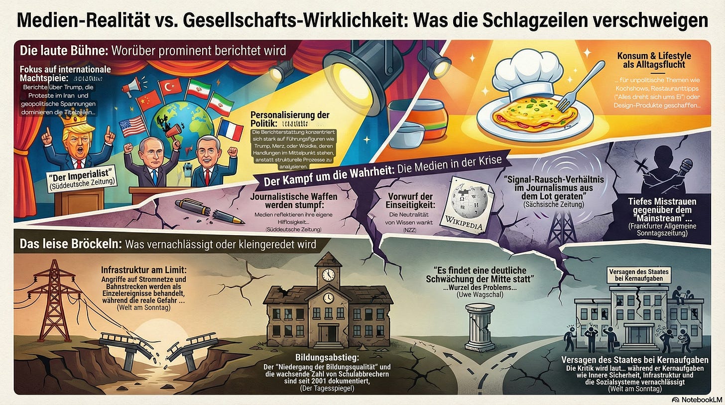 Es ist ein Paradoxon unserer Zeit: Wir sind so informiert wie nie zuvor, und doch verlieren wir den Blick für das Wesentliche. Die Schlagzeilen werden dominiert von einer Obsession mit internationalen Machtspielen, während die grundlegende Daseinsvorsorge im eigenen Land bröckelt. US-Präsident Donald Trump teilt die Welt ungeniert in Einflusszonen auf und verkündet eine „Donroe-Doktrin“, die das Völkerrecht durch das Recht des Stärkeren ersetzt. Seine Inszenierung der Festnahme des venezolanischen Diktators Maduro verfolgt er wie eine TV-Show, und die Weltöffentlichkeit starrt gebannt auf dieses Spektakel. Gleichzeitig richten sich die Augen auf den Iran, wo das Mullah-Regime wackelt und Hunderttausende „Tod dem Diktator“ rufen, während Trump droht, bei Tötung von Demonstranten militärisch einzugreifen. Diese geopolitischen Spannungen dominieren die Titelzeilen und binden unsere Aufmerksamkeit in der Ferne, während die Einschläge im Inneren näherkommen.